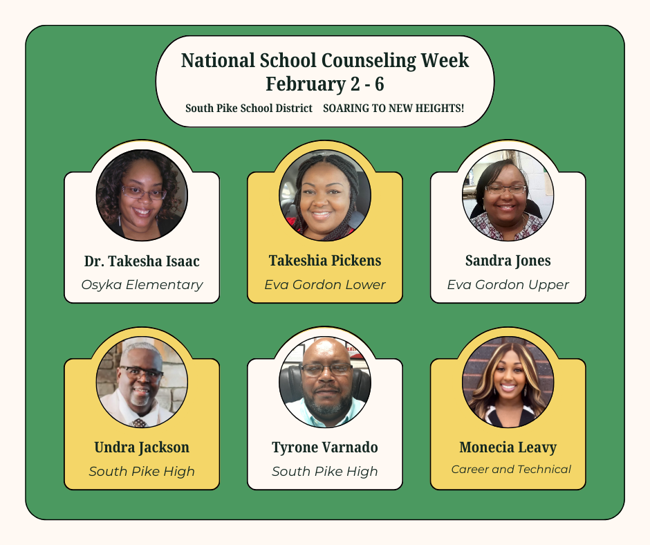 Join us in celebrating National School Counseling Week! We are proud to recognize the dedicated efforts of our amazing counselors: Dr. Takesha Isaac (Osyka Elementary), Takeshia Pickens (Eva Gordon Lower), Sandra Jones (Eva Gordon Upper), Undra Jackson and Tyrone Varnado (South Pike High), and Monecia Leavy (Career and Technical). Their commitment to supporting and guiding our students is truly inspiring. Let's give them a big thank you for helping our students soar to new heights! 🎓✨ #SchoolCounselingWeek #SoaringToNewHeights