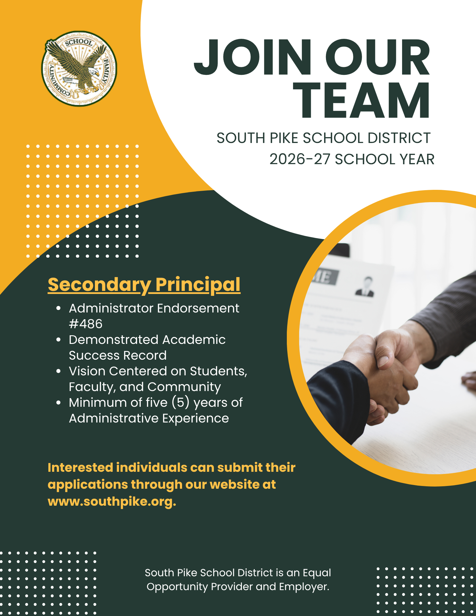 Exciting Opportunity Alert! South Pike School District is seeking a visionary Secondary Principal for the 2026-27 school year. If you have an Administrator Endorsement #486, a strong track record of academic success, and at least five years of administrative experience, we want to hear from you! Join us in shaping the future of education by applying today at www.southpike.org. South Pike School District is proud to be an Equal Opportunity Provider and Employer.