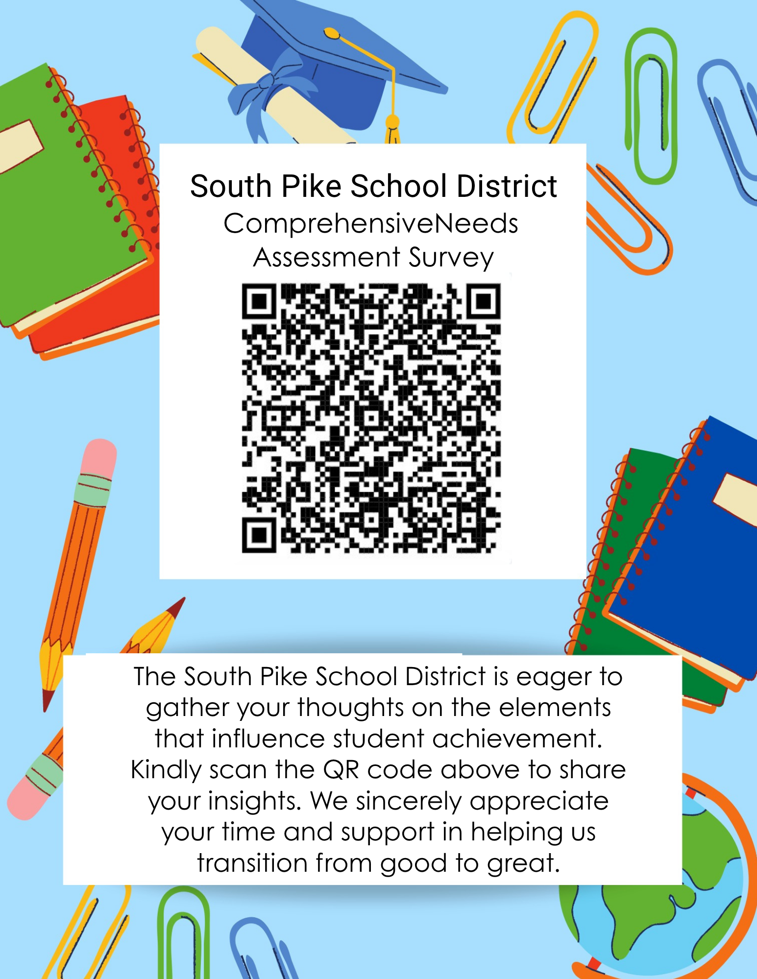 We're reaching out to our South Pike School District community! Your feedback is vital in our Comprehensive Needs Assessment, helping us enhance safety, employment, and fund allocation. Share your thoughts through our survey available until May 8, 2026. Let’s work together to elevate our district's performance from good to great! For assistance, contact Dr. Daniels-Lee. Your input matters!