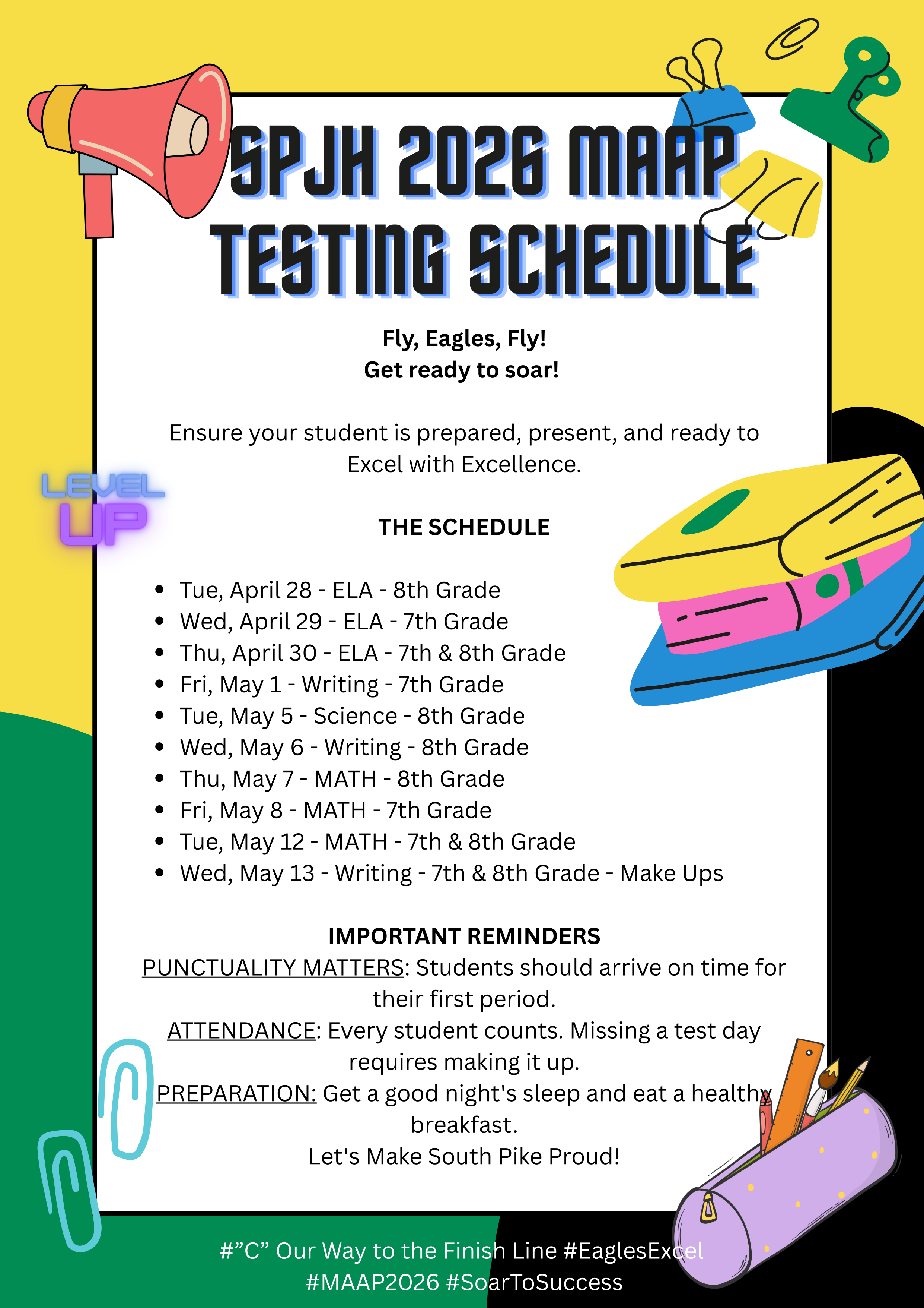 Fly, Eagles, Fly! It's time to soar with excellence! South Pike Junior High's MAAP testing schedule is set, and we want every student to be prepared and present. Here's the schedule: